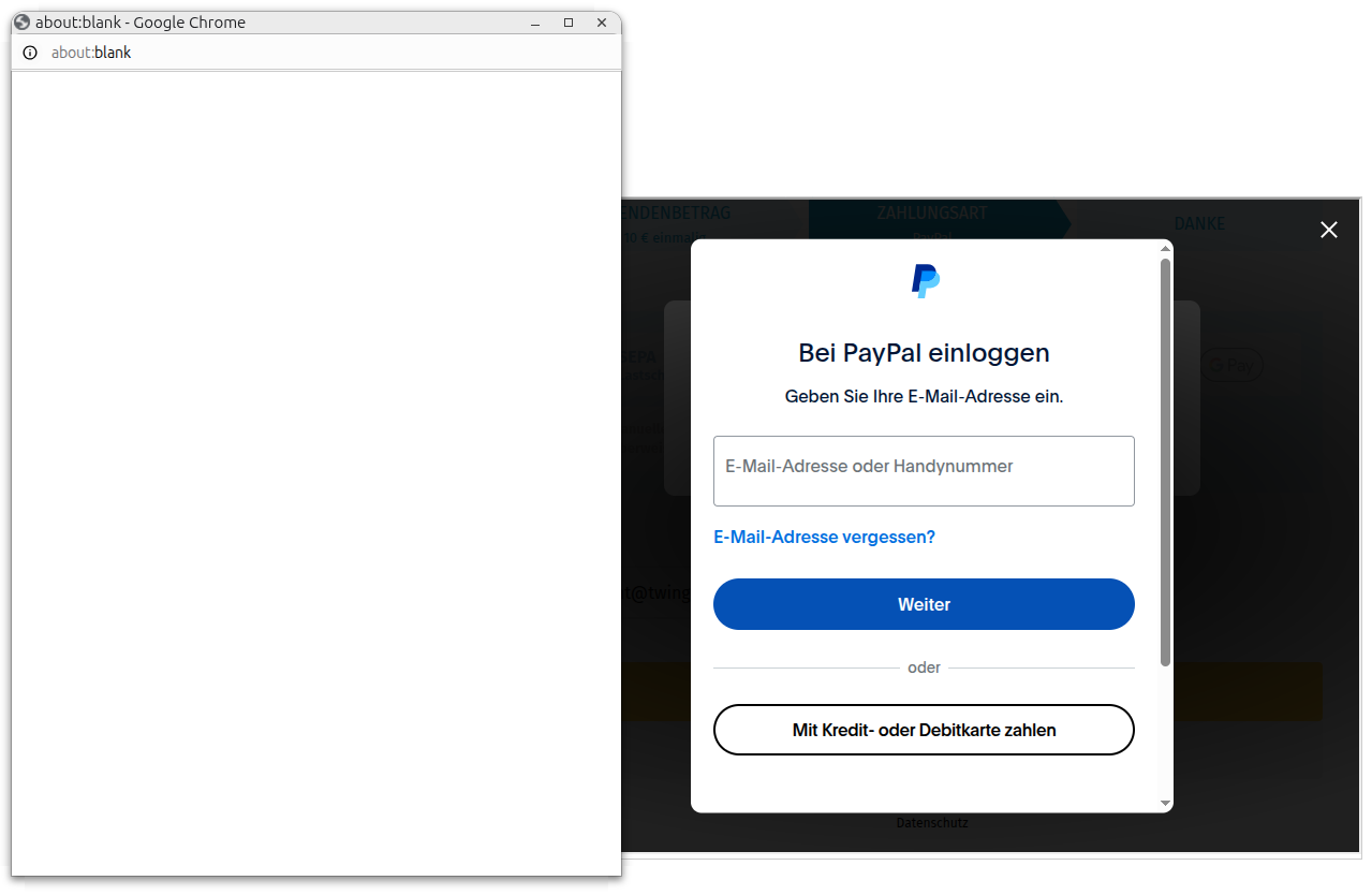 Symptome: Nach dem Starten einer Zahlung öffnen sich ein leeres Popup, danach noch ein Overlay über dem Widget mit einer Loginmaske.