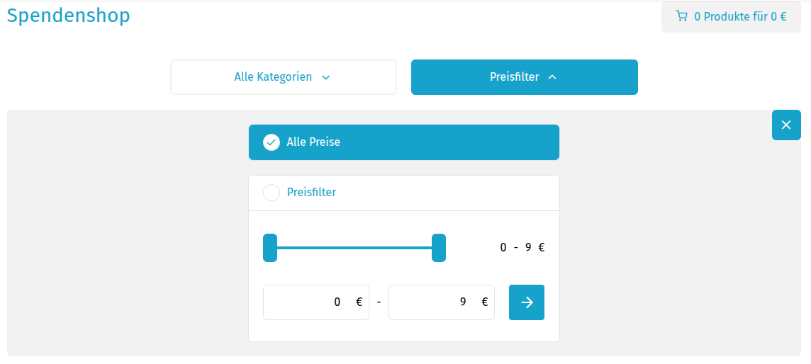 Ansicht des Preisfilters im Spendenshop