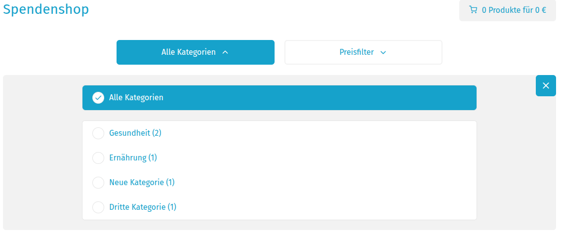 Ansicht des Kategoriefilters im Spendenshop