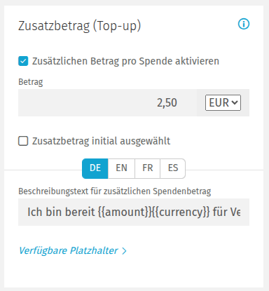 Um zwischen einem festen Wert und einem prozentualen Anteil hin und her zu schalten, nutzen die Umschaltung rechts neben dem Betrag. Der Text darunter wir dann neben der Checkbox angezeigt, mit der Spender:innen diesen Betrag aktivieren können. Bitte beachte die verfügbaren Platzhalter die Du in dem Text nutzen kannst.