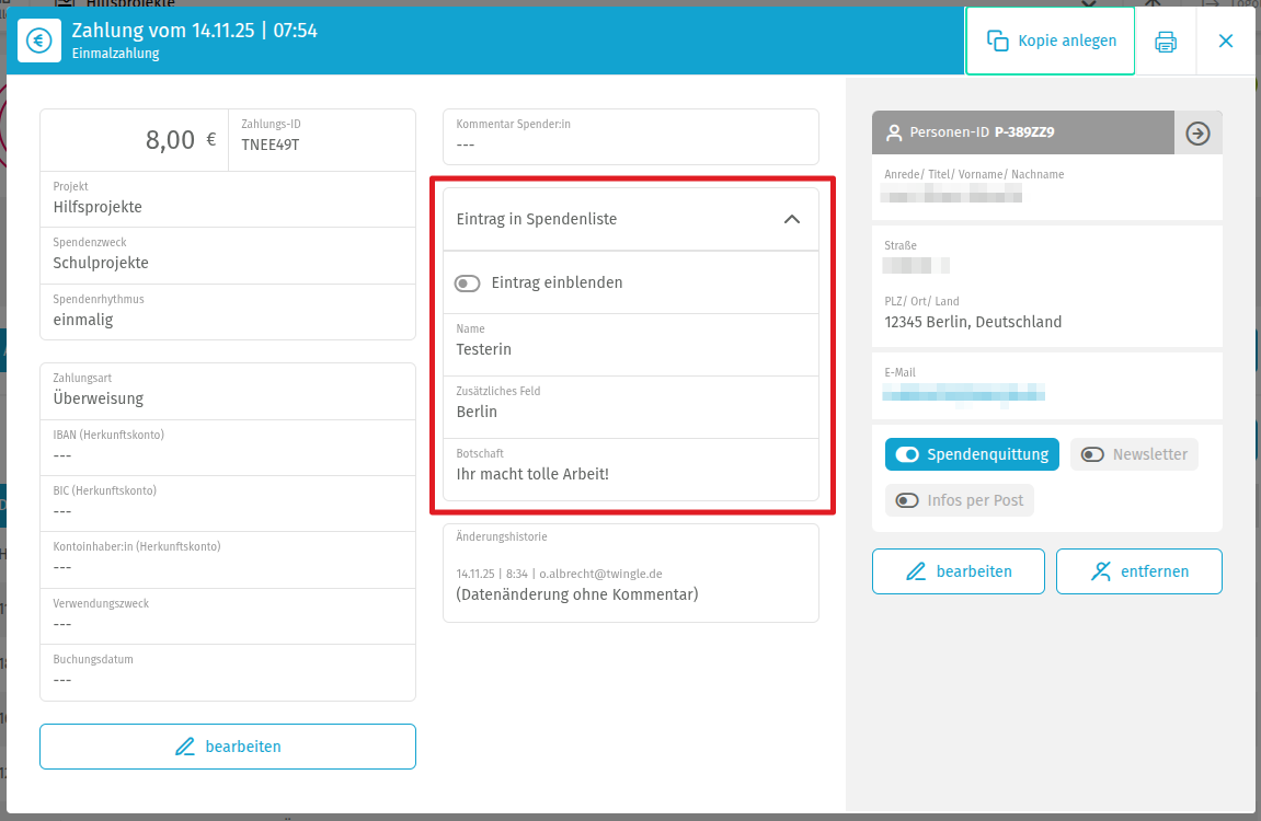 Wenn Spender:innen sich bei Dir melden und Daten geändert haben wollen, kannst Du diese im twingleMANAGER in den Details der Spende ändern. Öffne dazu die Spende und klappe den Bereich "Eintrag in Spenderliste" auf: