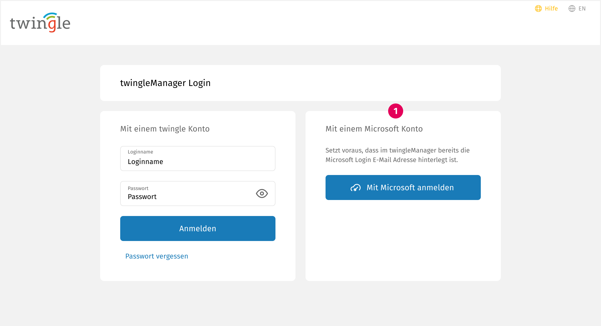 Der Login mit dem Microsoft-Konto wird auf der rechten Seite (1) der Loginmaske durchgeführt.