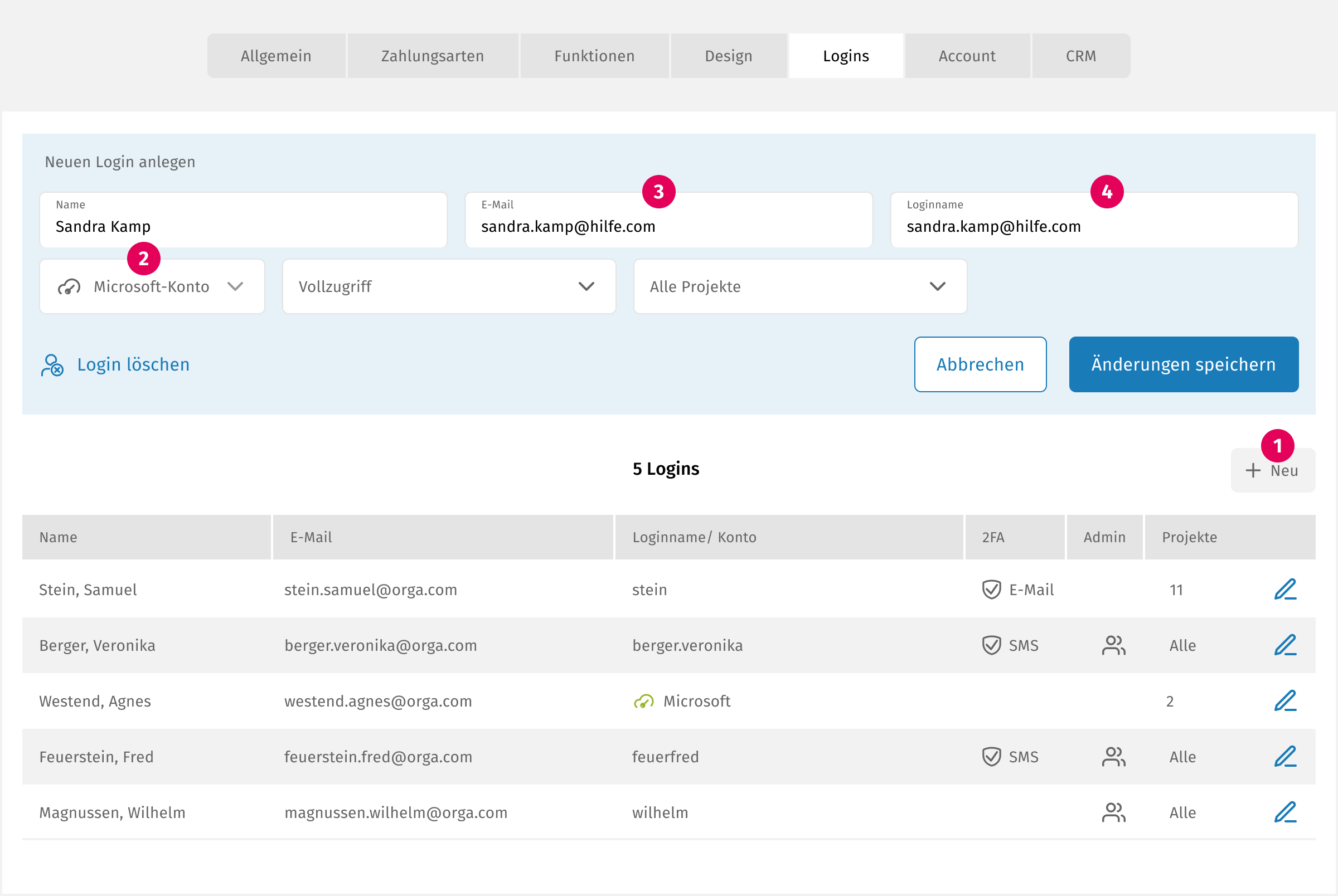 Wenn Du einen neuen Account im twingleMANAGER anlegst (1), wähle "Microsoft-Konto" (2) als Loginservice aus. Gib die E-Mail-Adresse des Microsoft Kontos bei "E-Mail" (3) und bei "Loginname" (4) an. Die E-Mail-Adresse muss identisch beim Loginnamen hinterlegt sein, sonst wird sich die Person nicht im twingleMANAGER einloggen können.